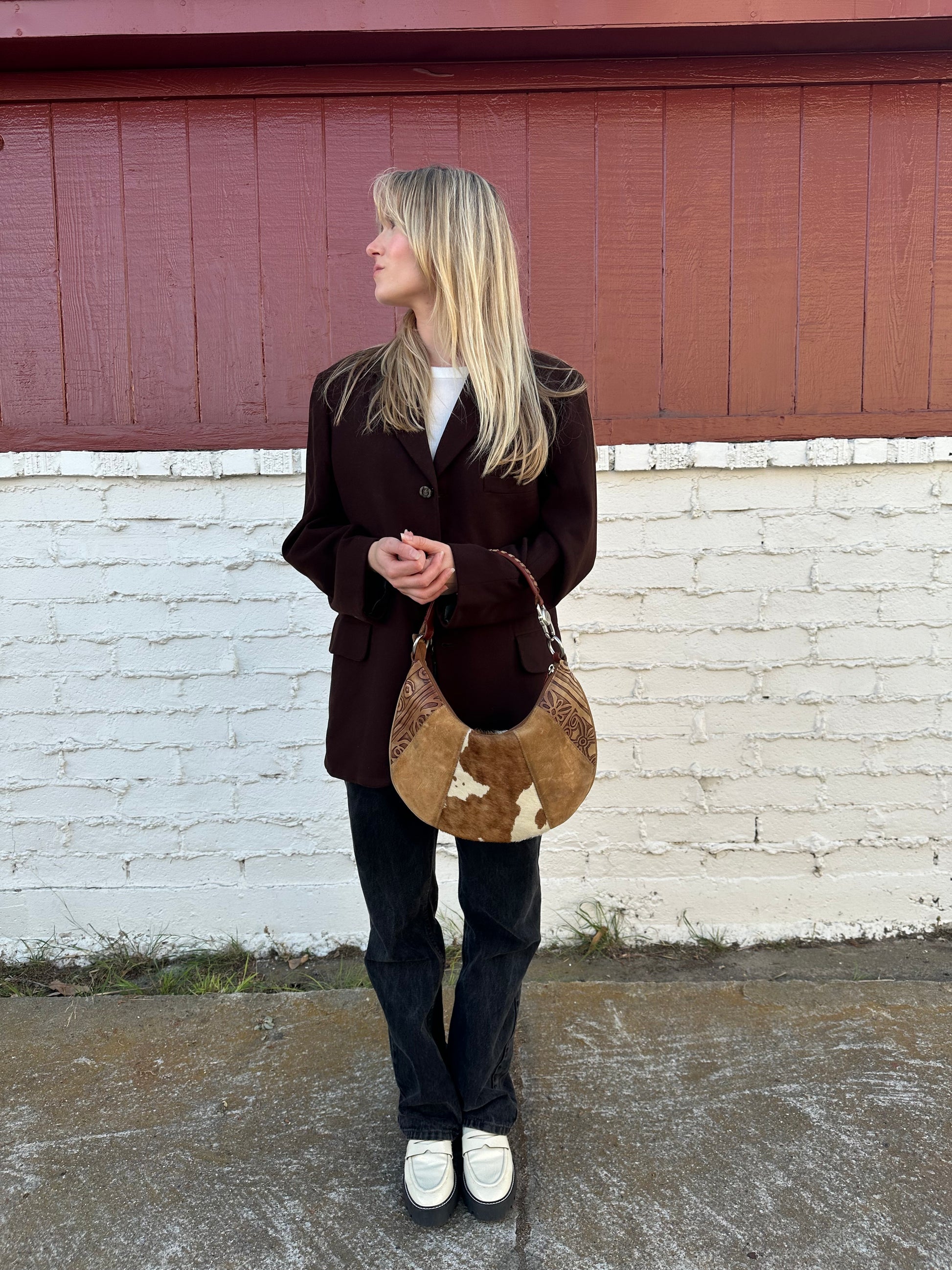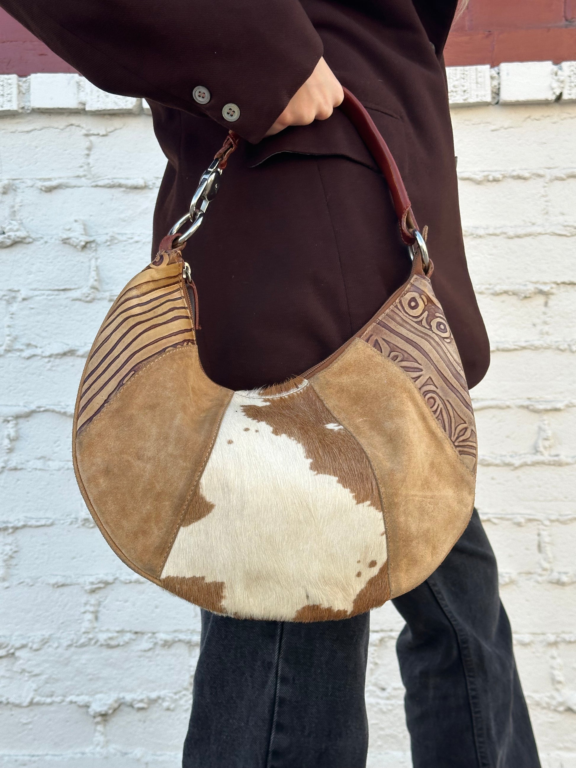 One-of-a-kind cowhide and leather shoulder bag. The strap has a beautiful woven detailing and silver hardware. The perfect every day staple piece.