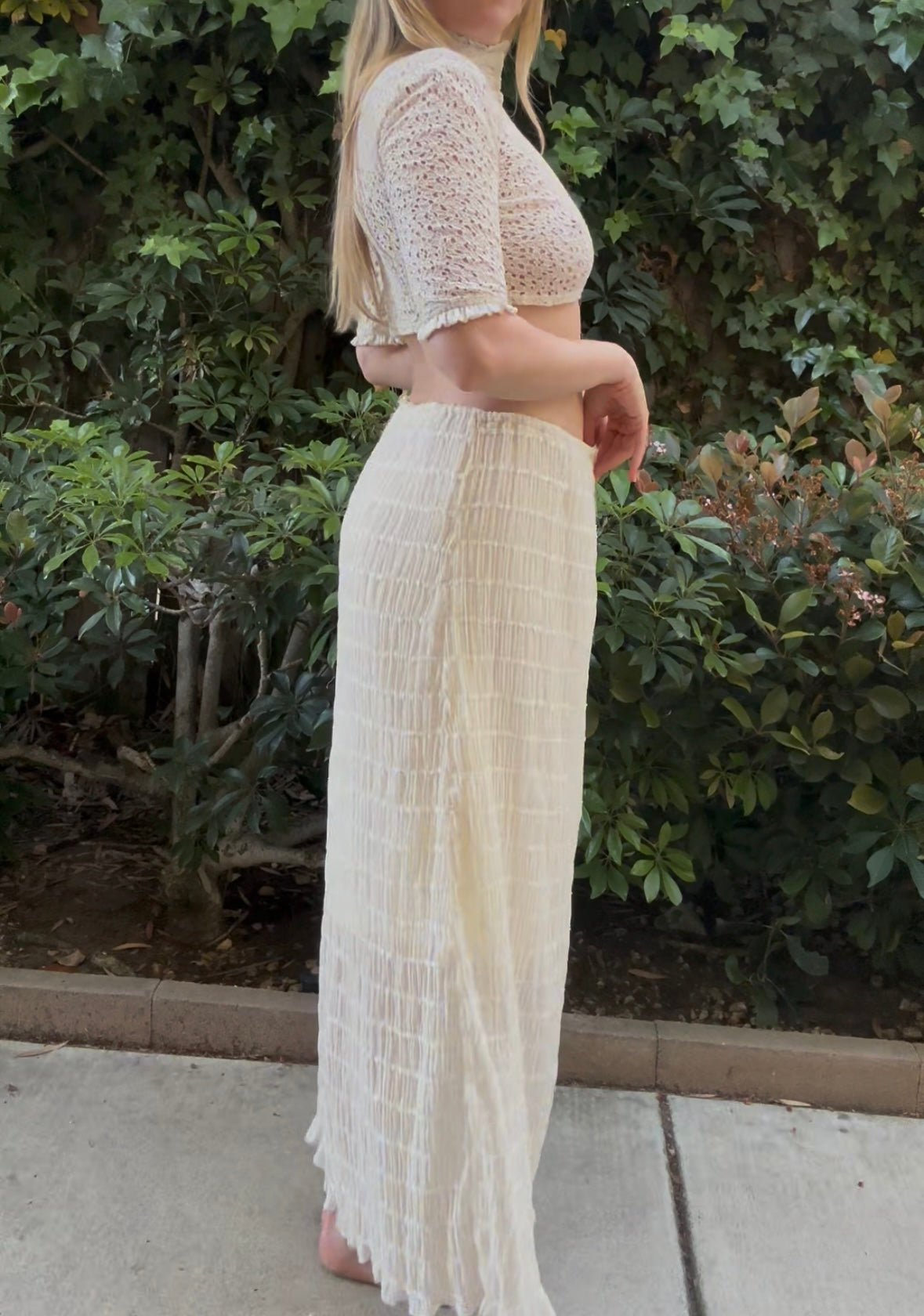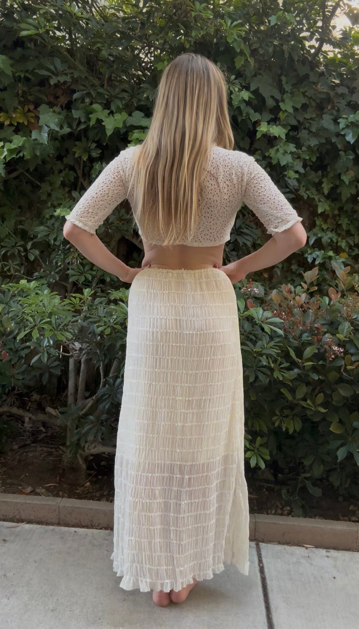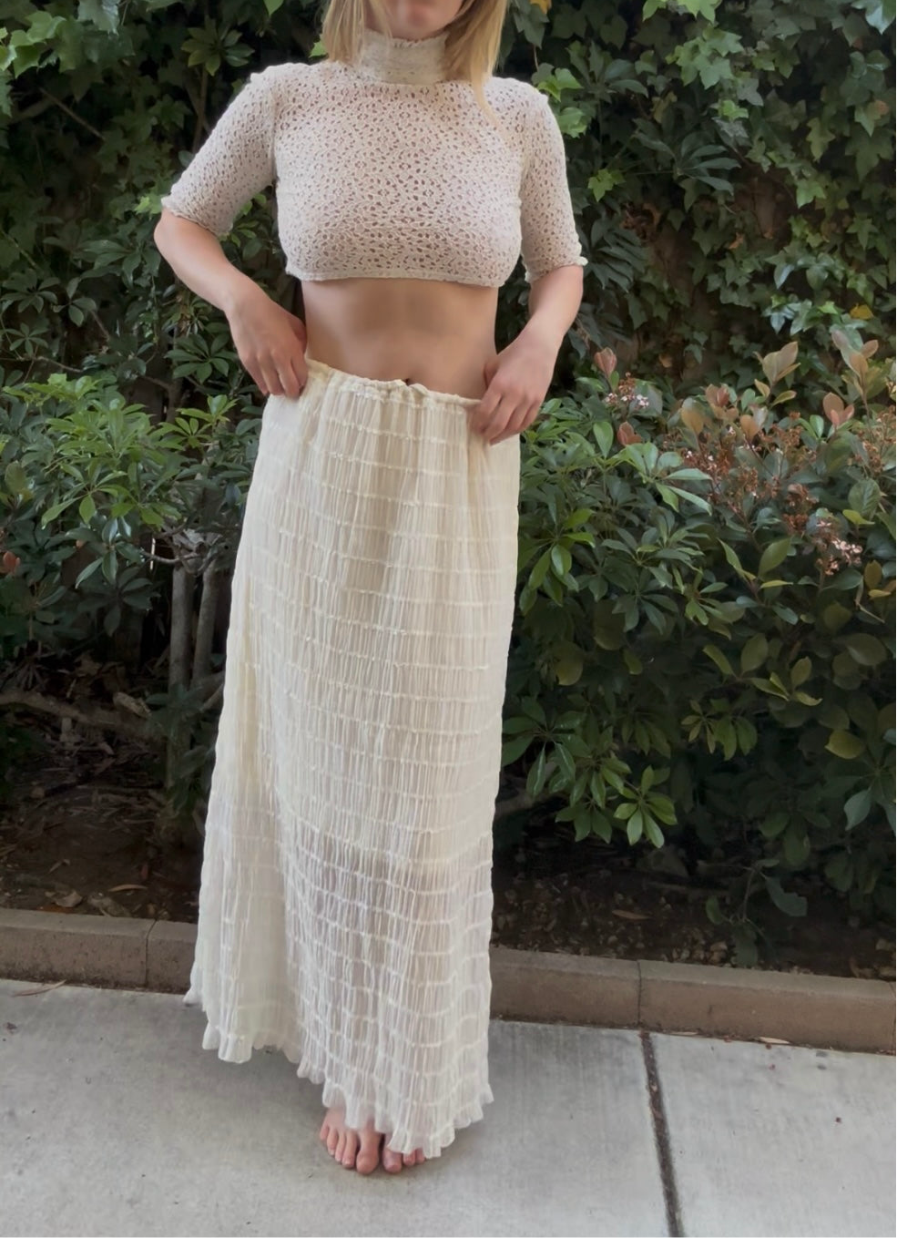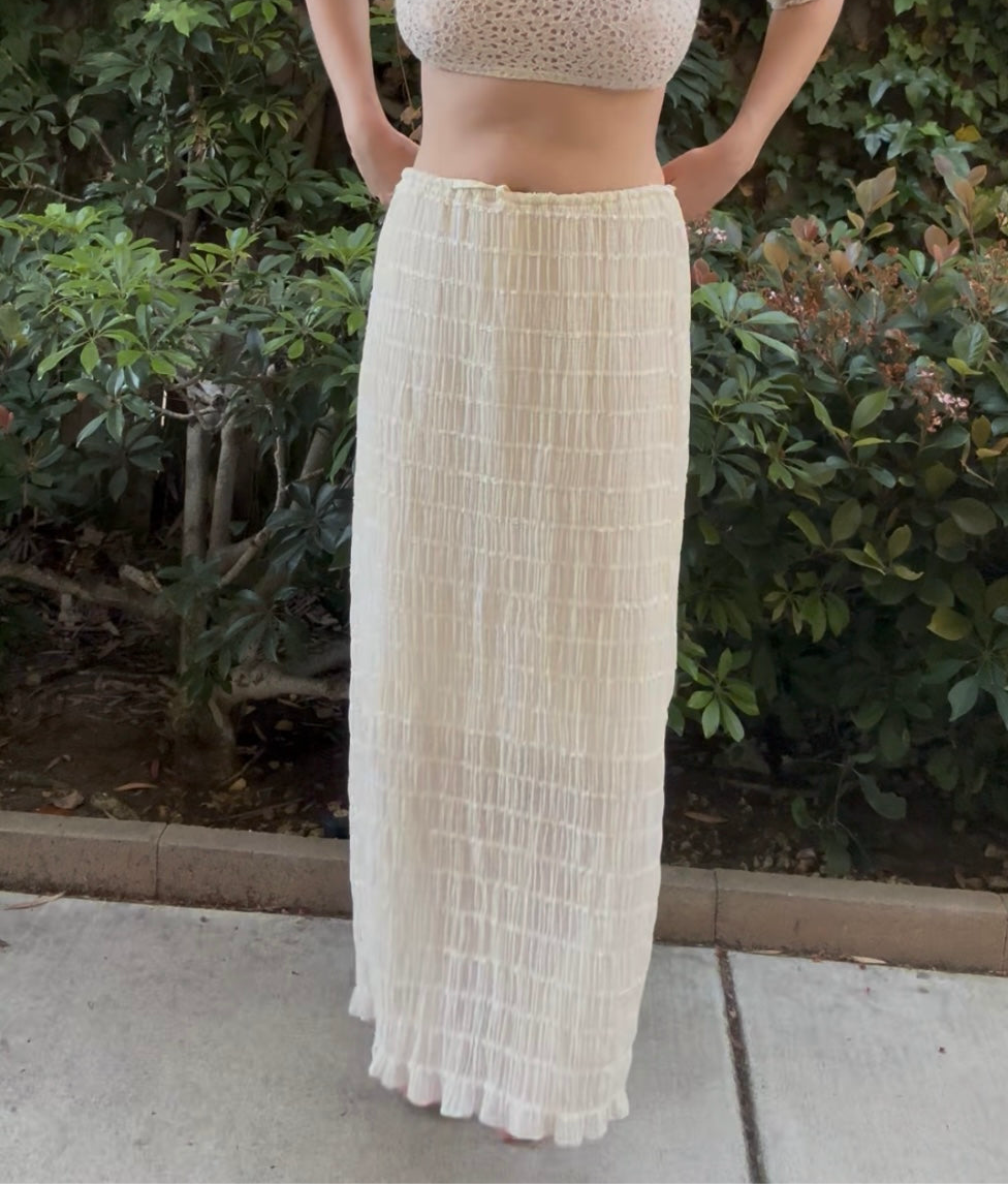 Sheer lined cream maxi skirt with stretchy waistband. Size can be adjusted with drawstring. Marked a size large but can fit a size small-large.