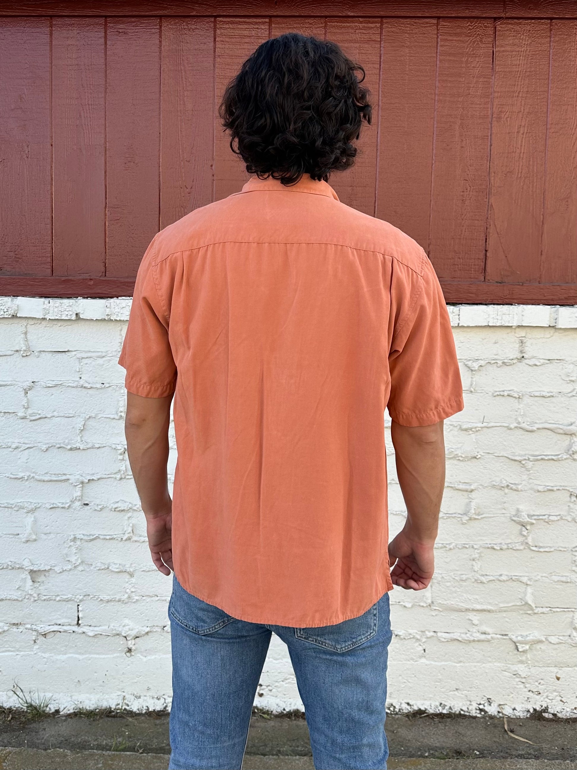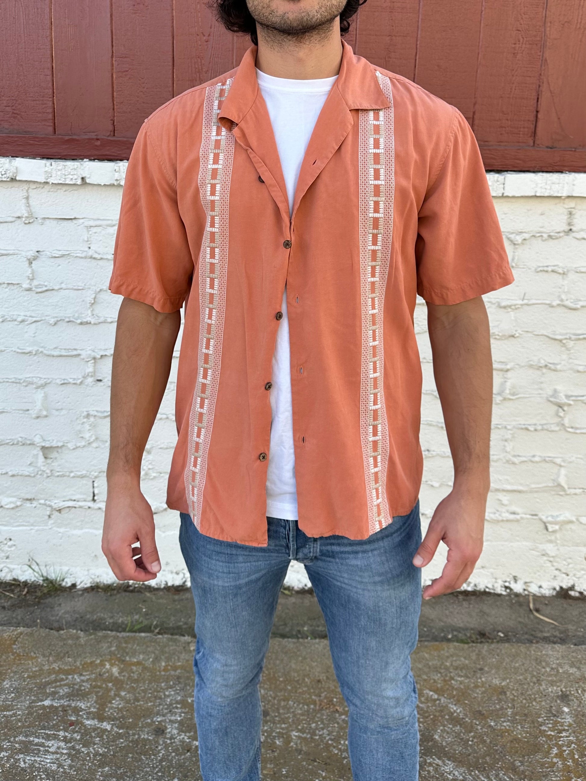 100% silk orange men’s button down. Marked a size XL and fits true to size.