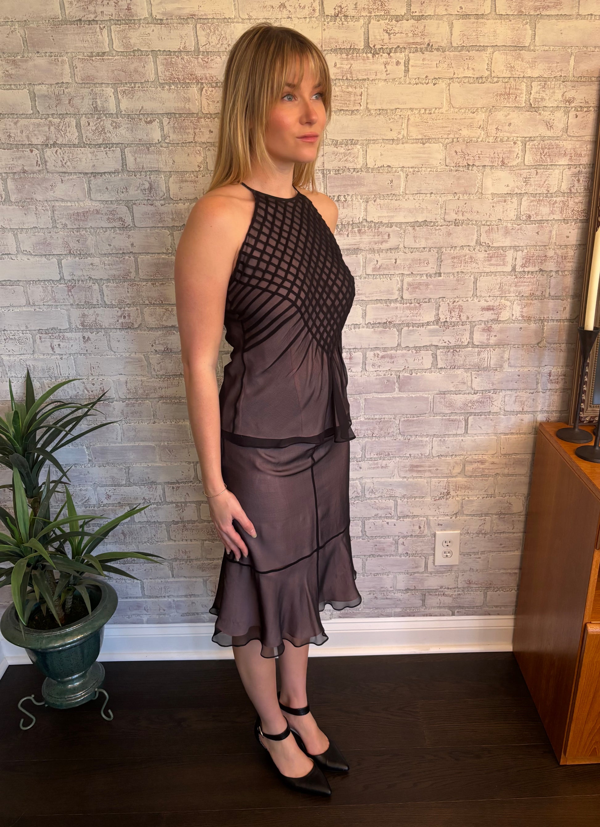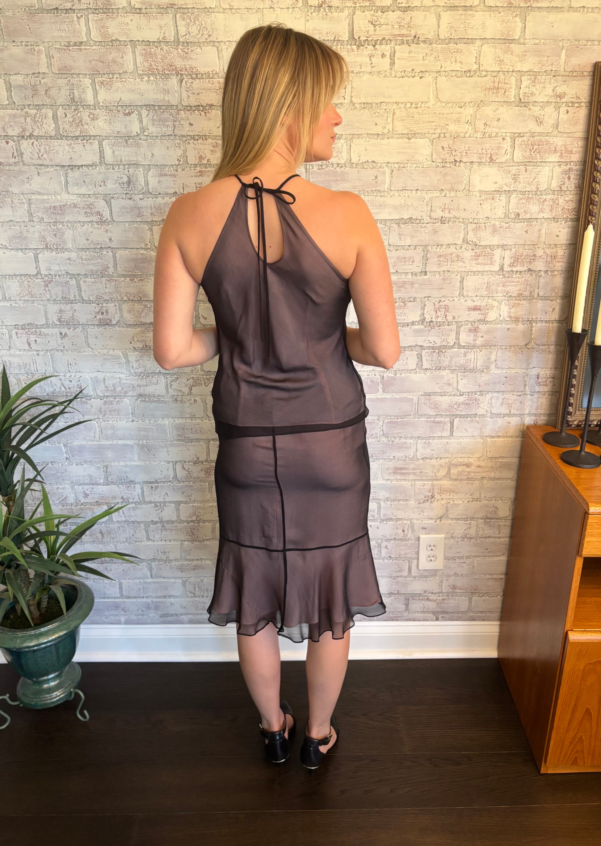 Insane vintage 90s 100% silk set, including a halter top and ruffle hem midi skirt. This set is fully lined. Marked a size 4 and fits true to size.