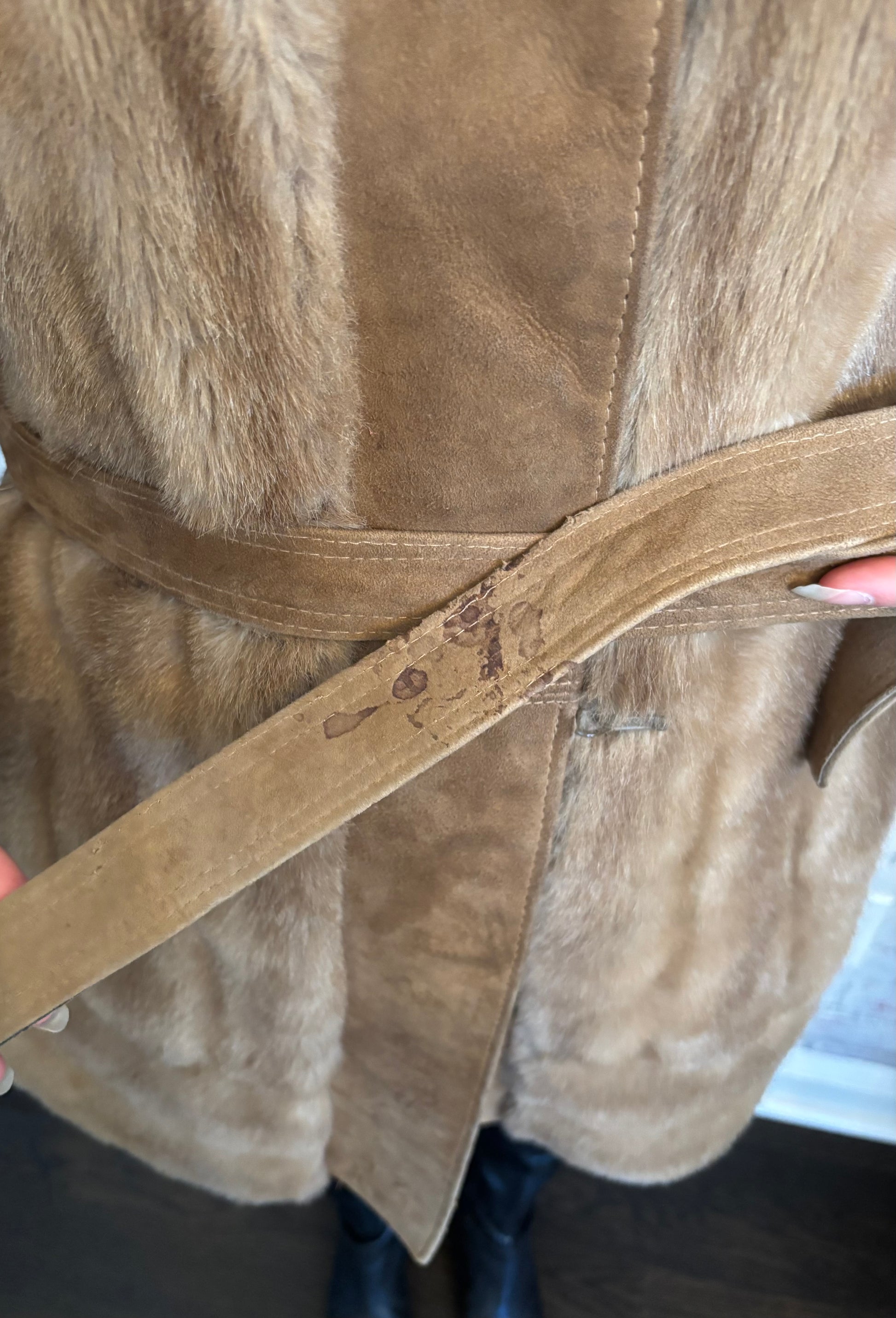 Gorgeous vintage 1970s brown faux fur and genuine leather coat. Perfect for the winter months or thrown over a holiday dress to keep warm for a holiday party. Can be worn without belt. No marked size but best fit for a size extra small-medium, depending on desired fit.