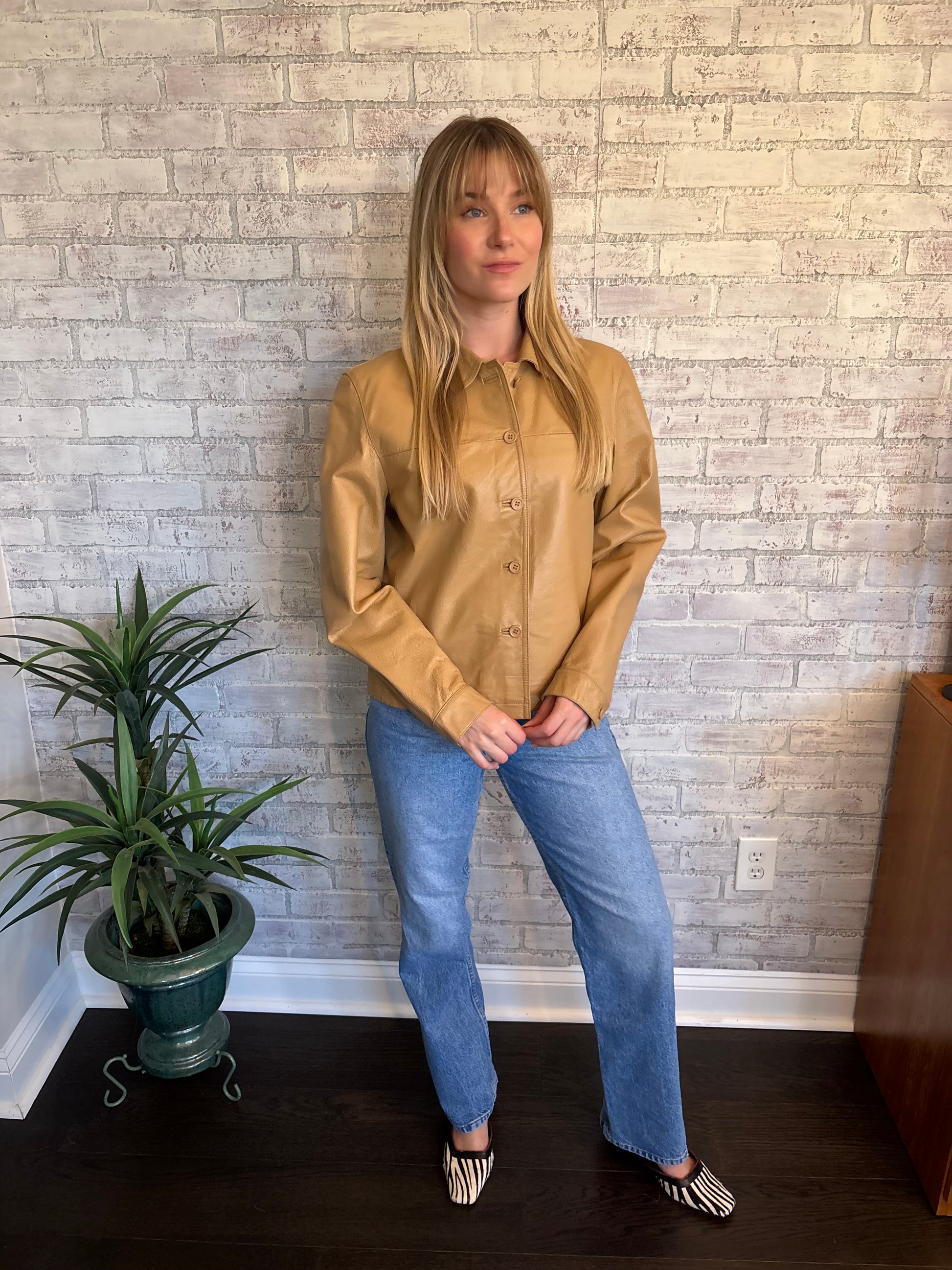 Vintage tan leather jacket. This jacket is perfectly structured. Marked a size 14 and best fit for a size extra small-medium, depending on desired fit.