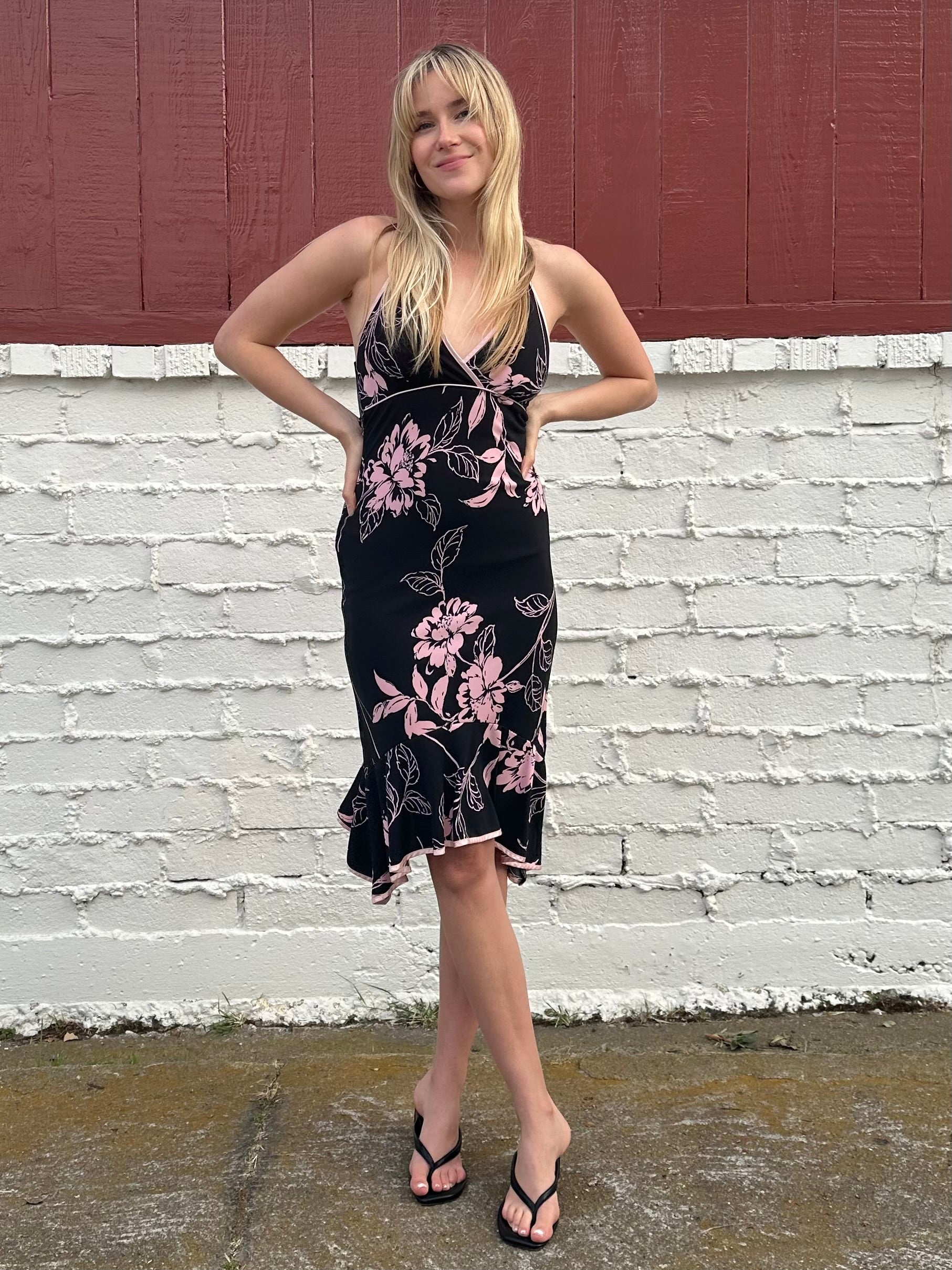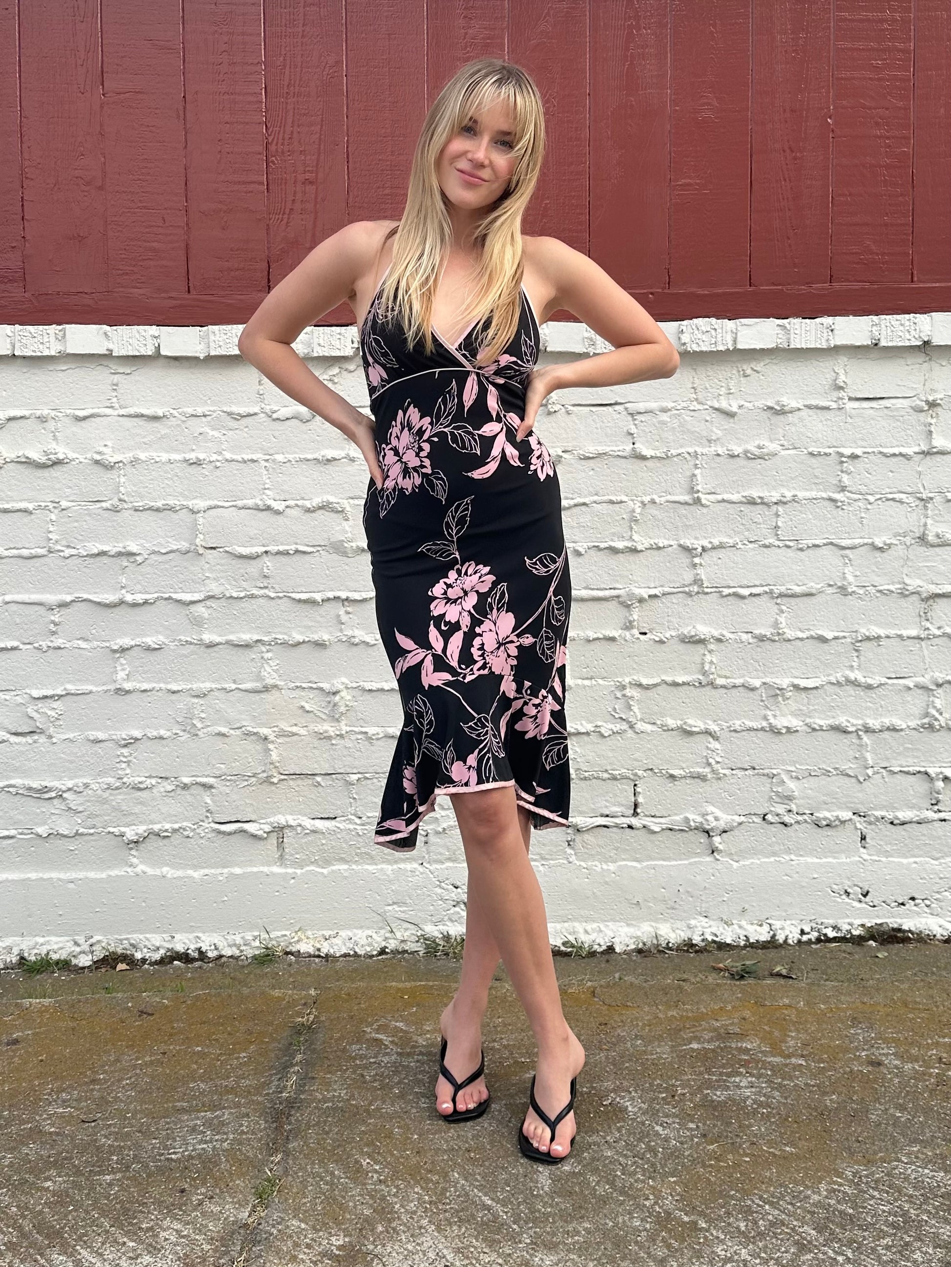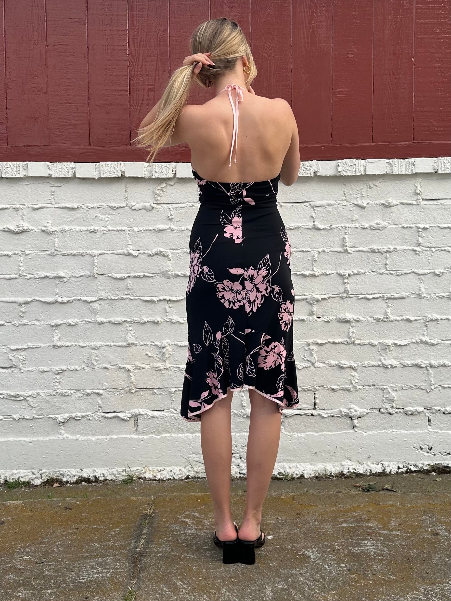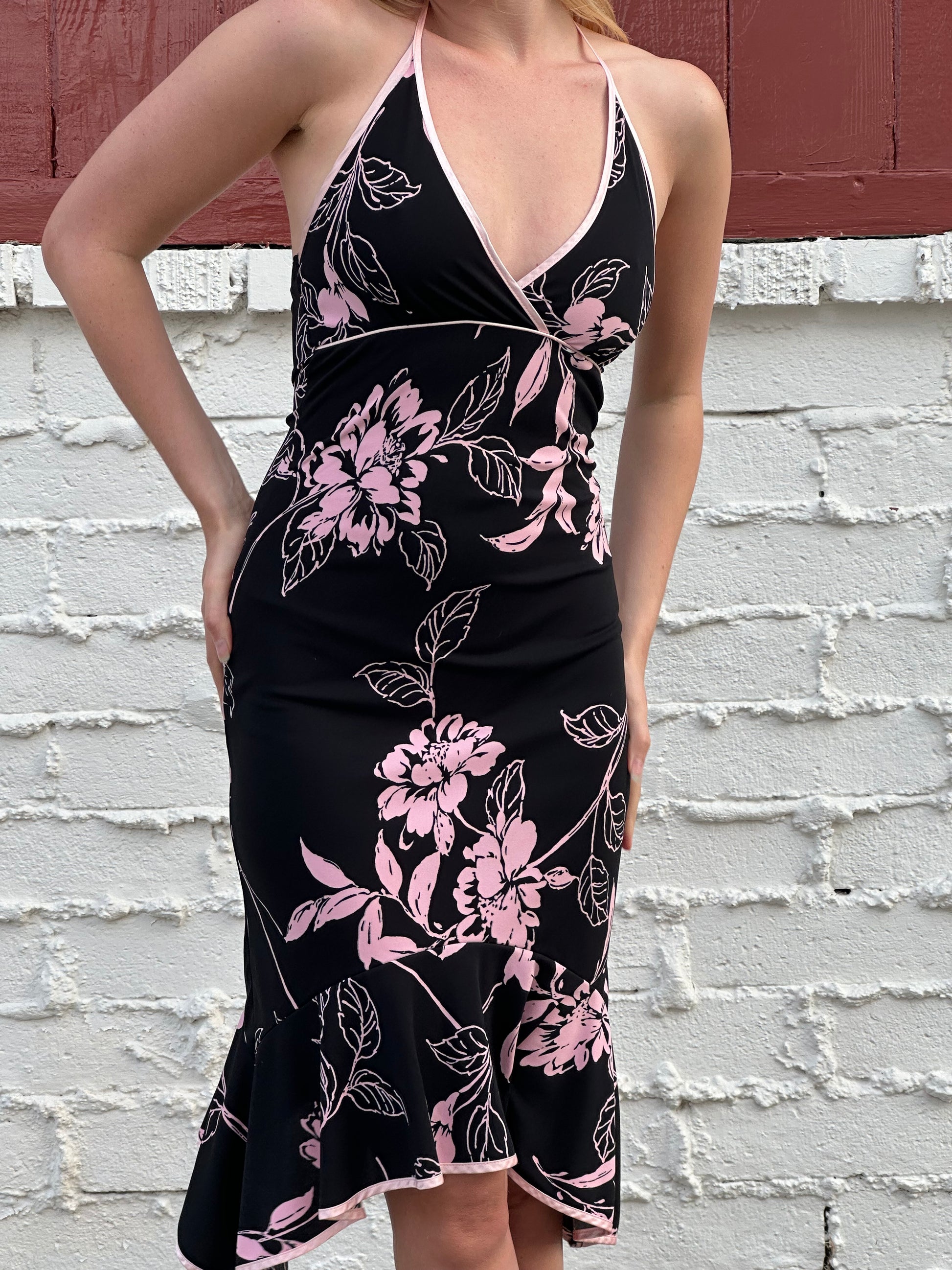 The cutest y2k floral black halter midi dress. Obsessed with the ruffle detailing on the bottom!! Marked a size small and fits true to size. Best fit for a size extra small-small.