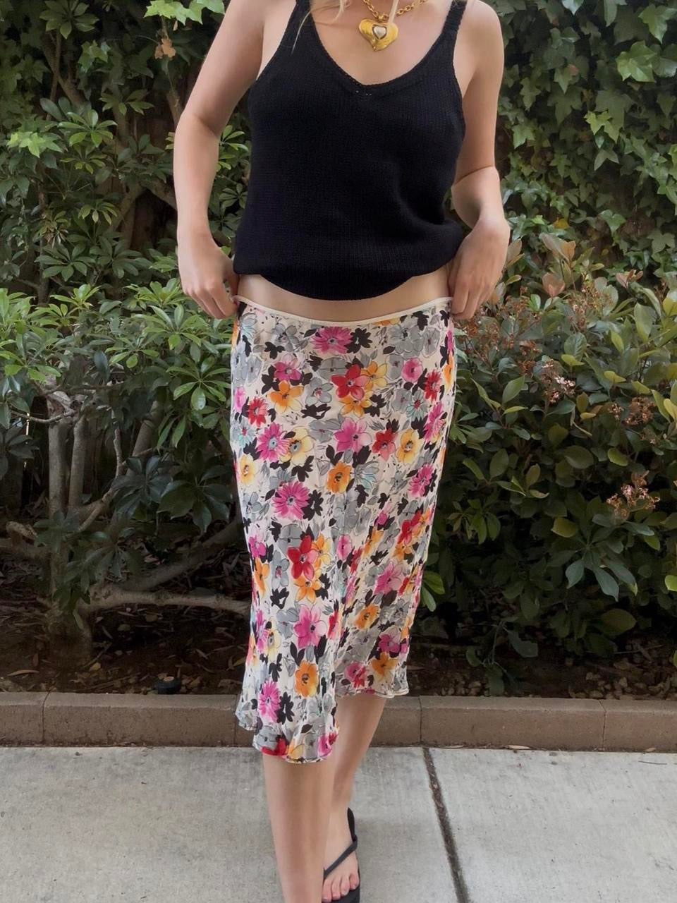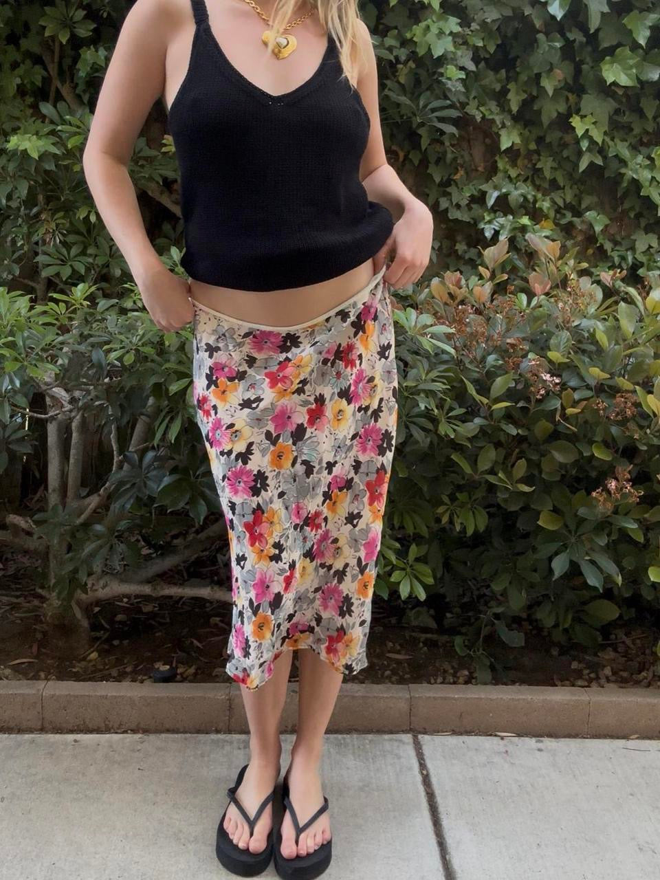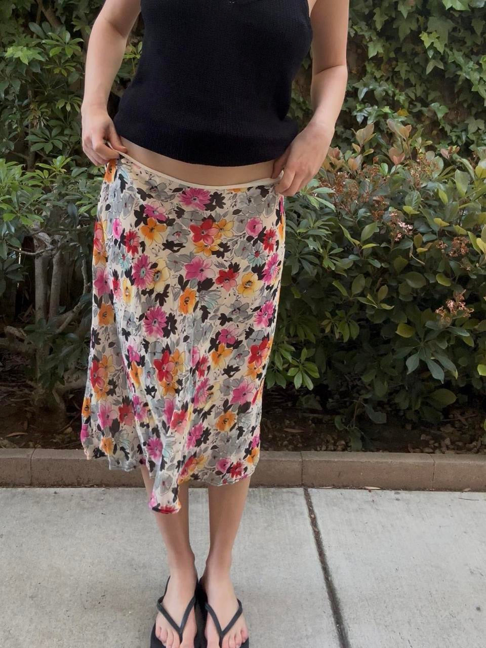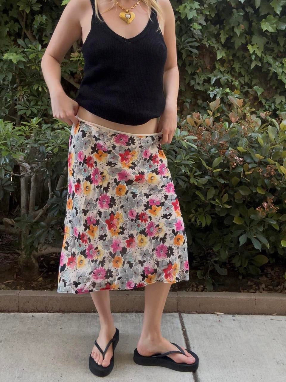 Vintage Y2K floral midi skirt. So cute!! Has a stretchy waistband. Marked a size XL and fits true to size. Would be so cute paired with some kitten heels this summer!