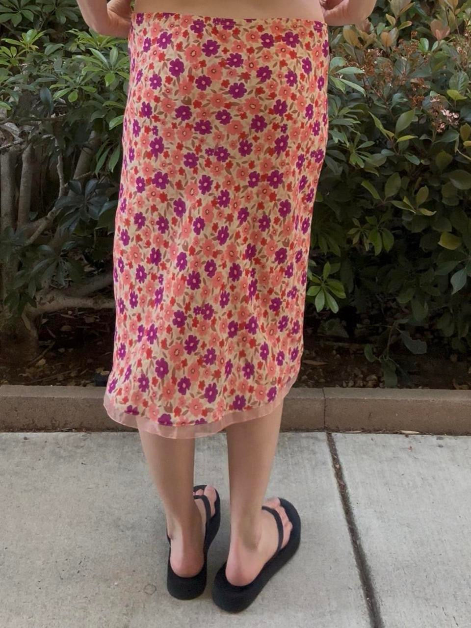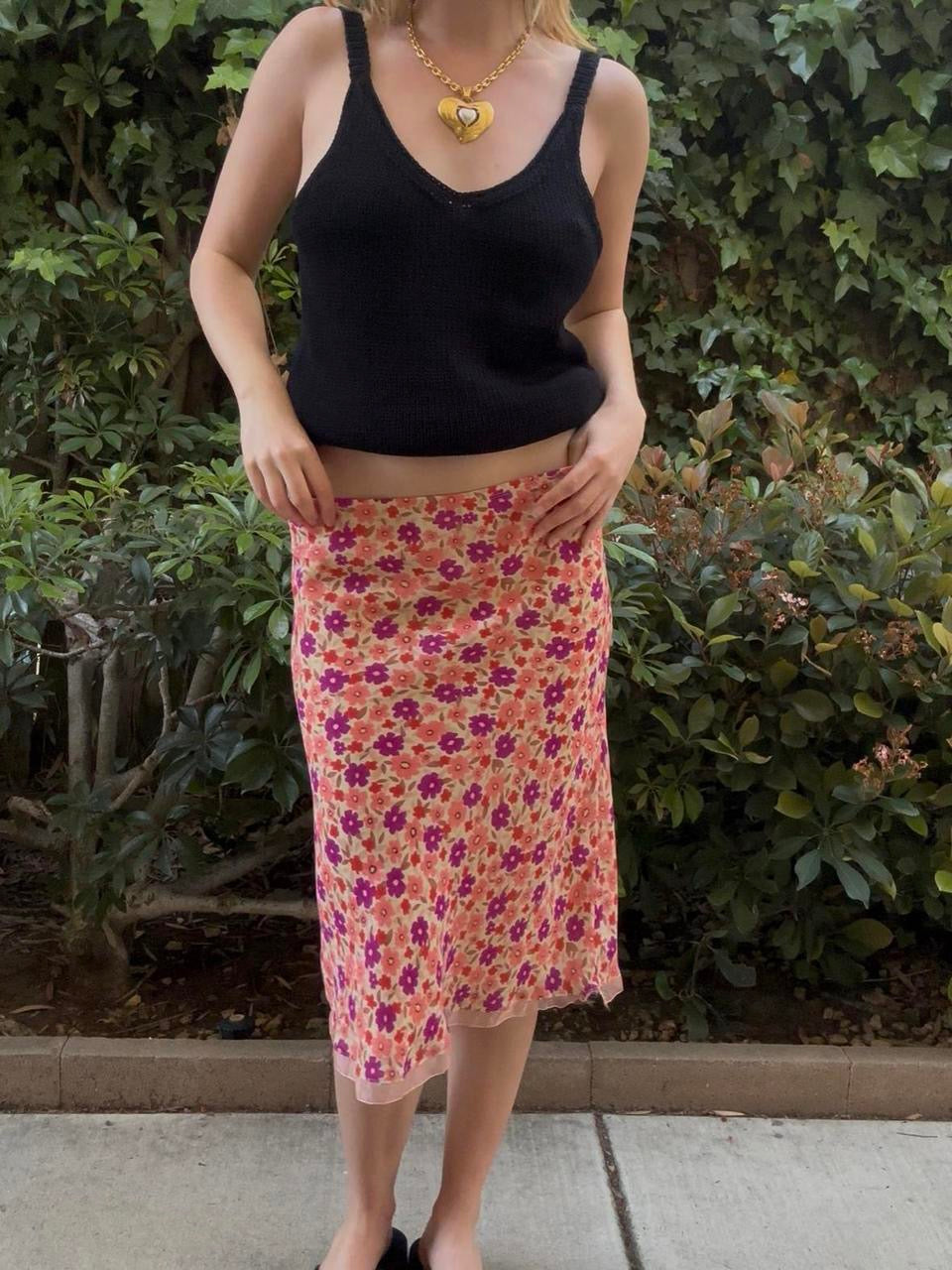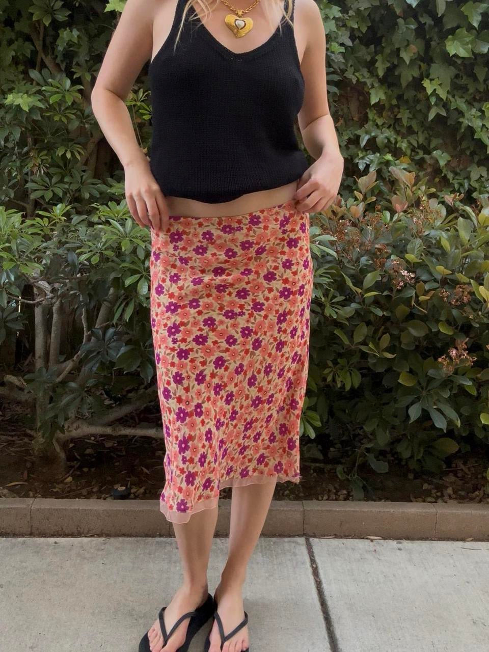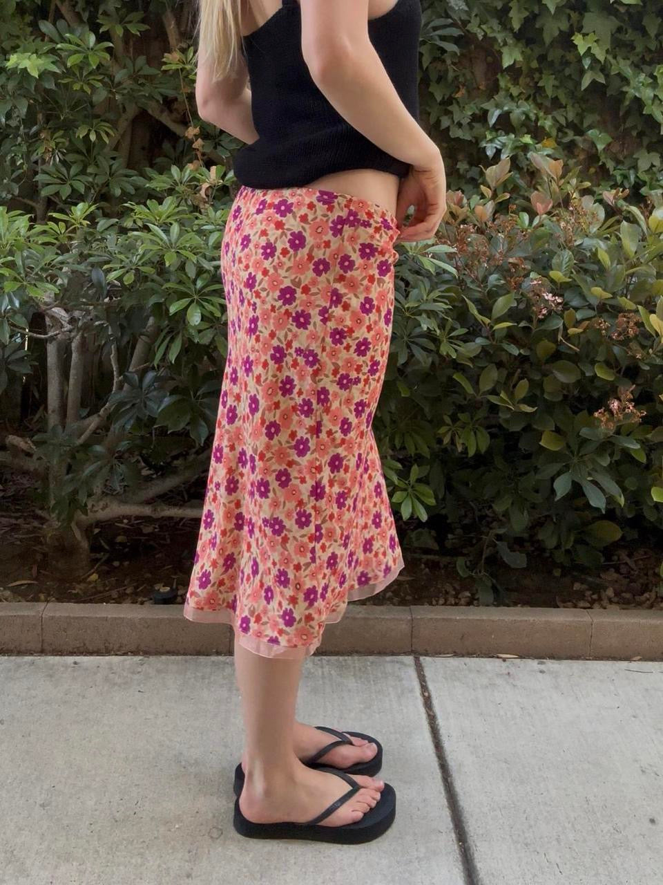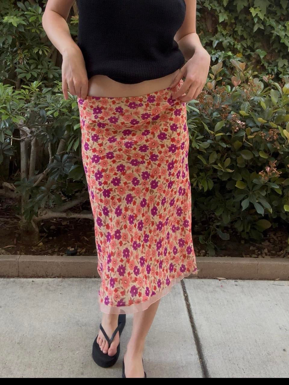 Adorable y2k floral midi skirt with cutie sheer trim!! So cute! Marked a size small and can fit a size small-medium. Would be so cute paired with some kitten heels this summer!